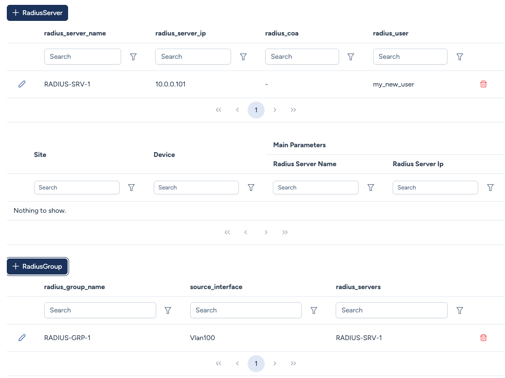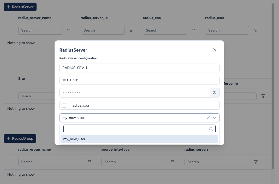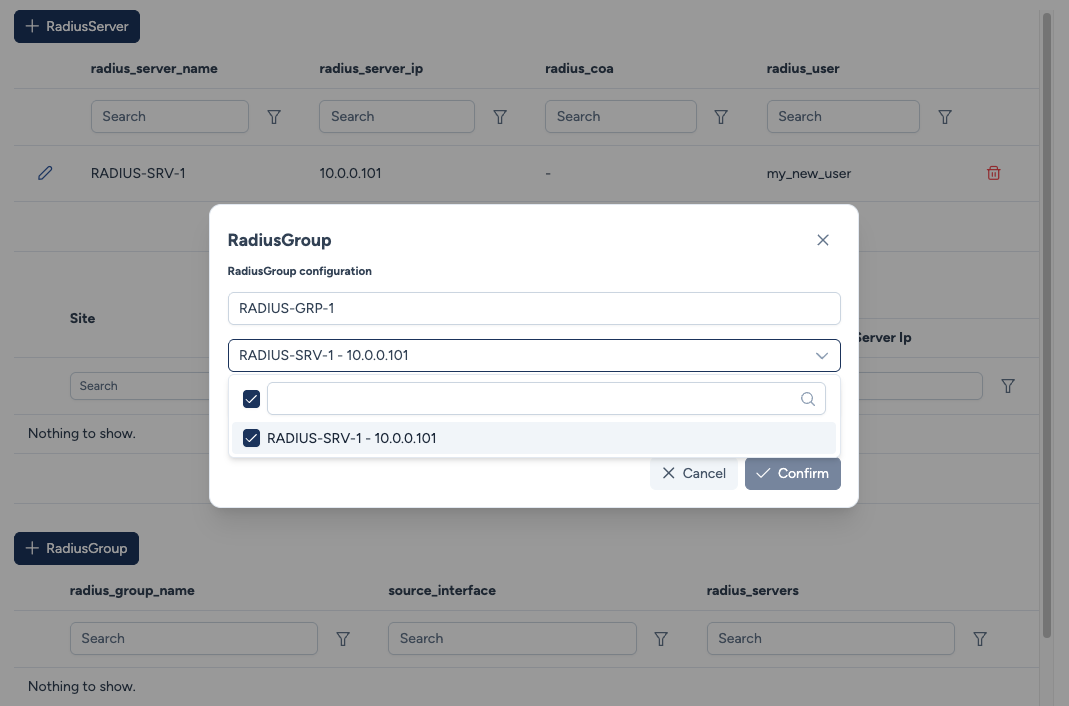 Vlan100ouLoopback0). - Radius Servers : Un menu déroulant pour choisir quels Serveurs RADIUS appartiennent à ce groupe.