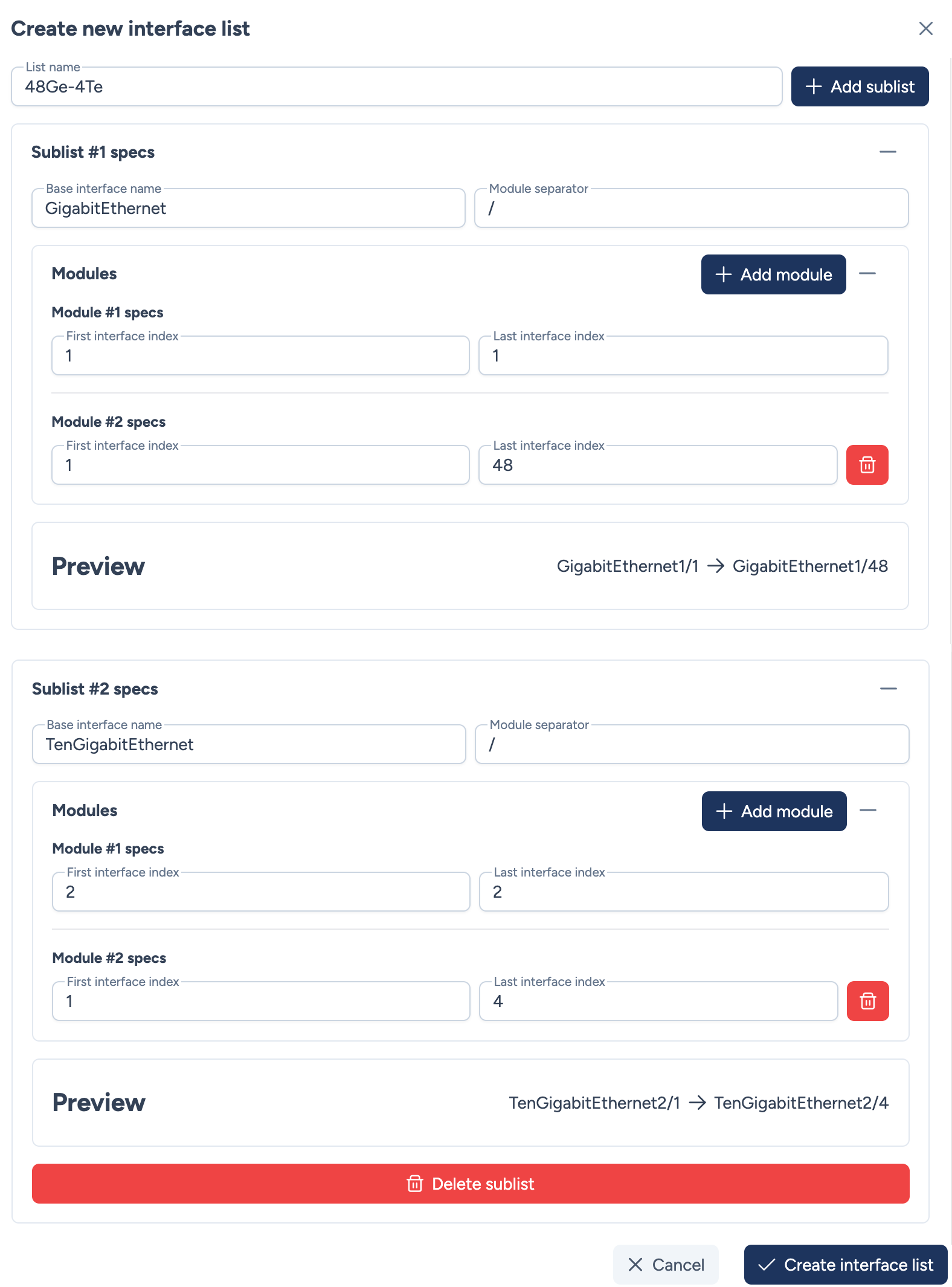 Première sous-liste avec 48 interfaces en GigabitEthernet