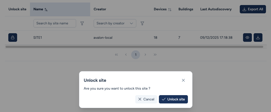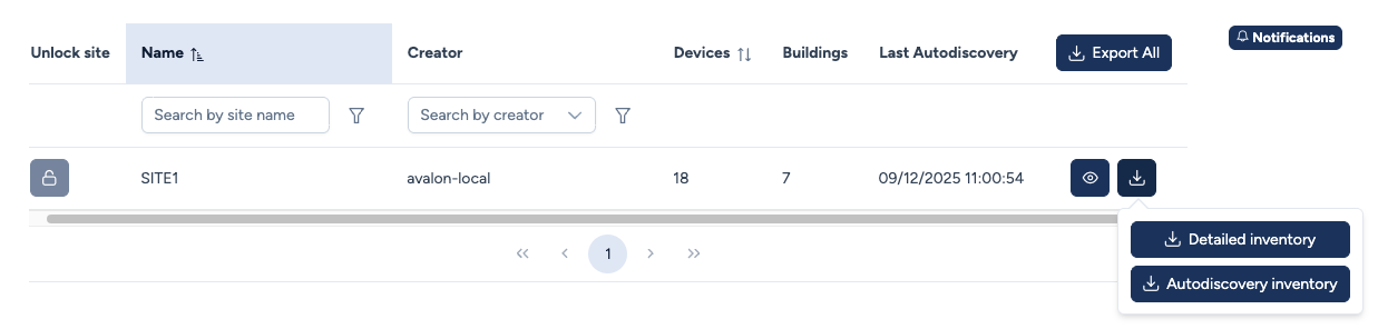 - Export All : Télécharge un CSV contenant l'inventaire de tous les sites du tableau (inclut une colonne "Site" pour distinguer les actifs).