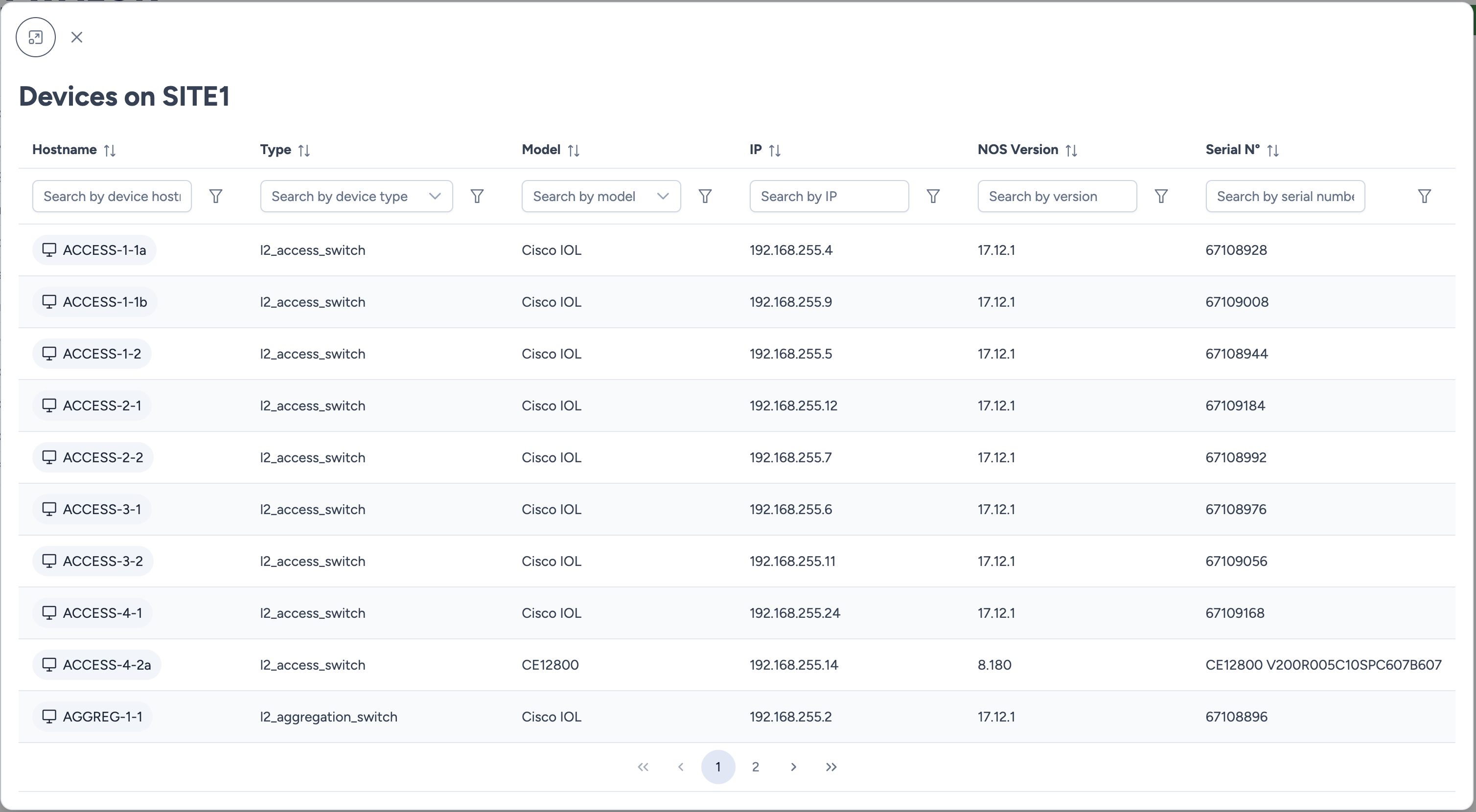 - icône oeil Ouvre le tableau de bord du site avec l'inventaire détaillé des équipements et la carte topologique.