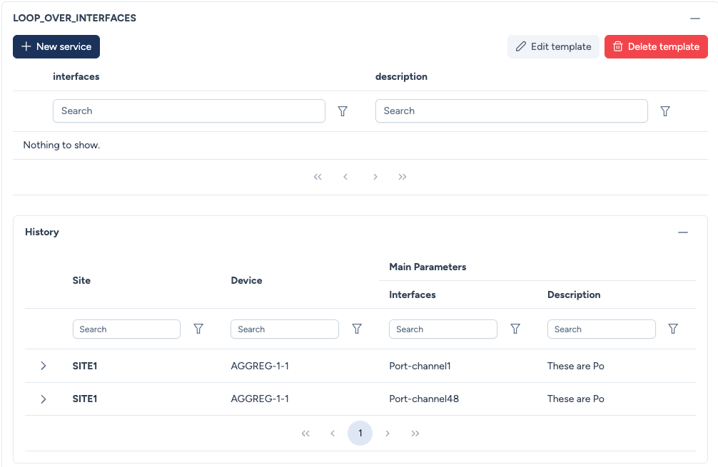 Lors du lancement du service, vous devez fournir les paramètres définis dans le modèle. Pour les paramètres de type interface, vous pouvez choisir depuis l'inventaire réel de l'équipement.