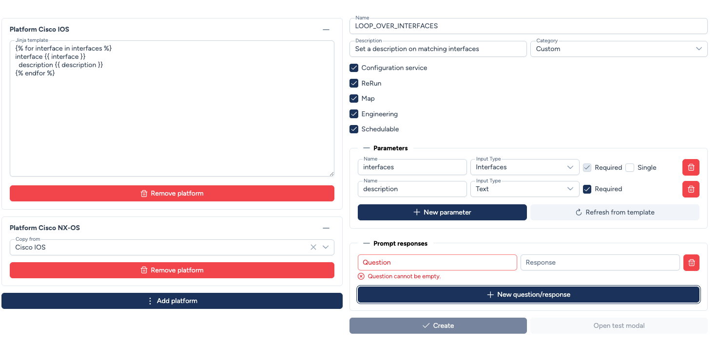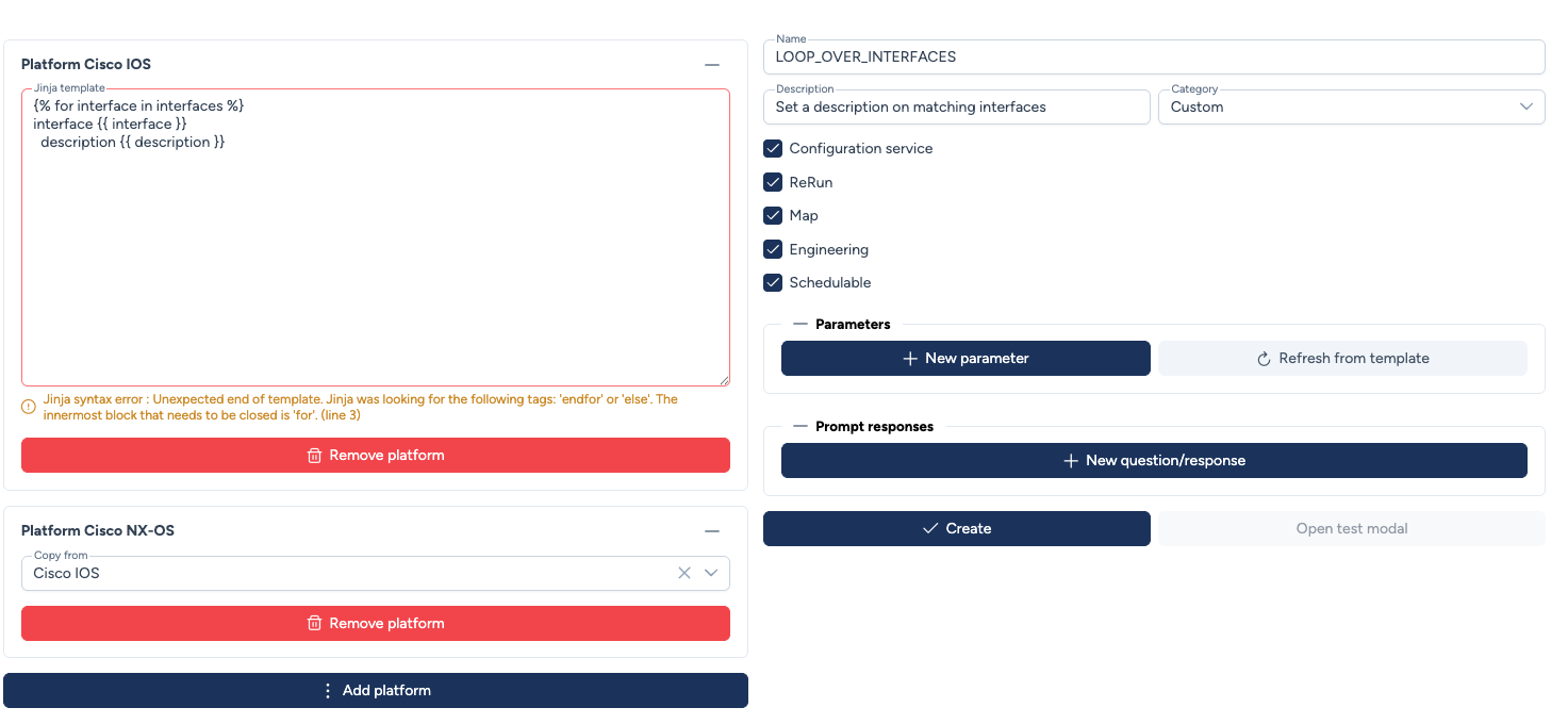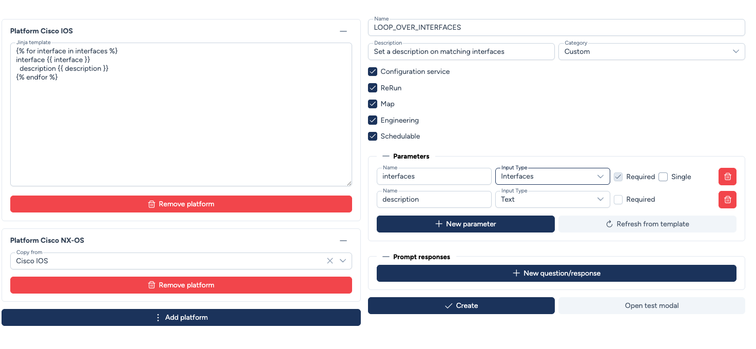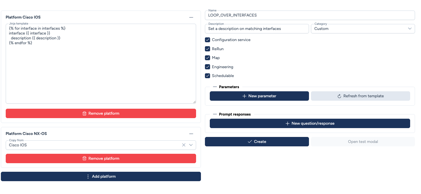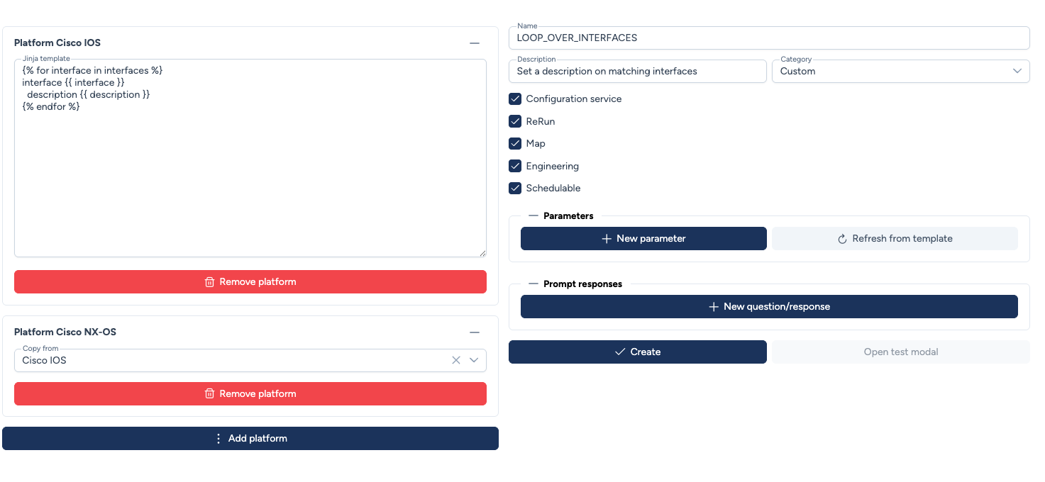 - Vous pouvez définir un template par plateforme ou réutiliser un template pour plusieurs plateformes quand cela est possible (certains templates IOS XE peuvent fonctionner sur NX-OS par exemple)