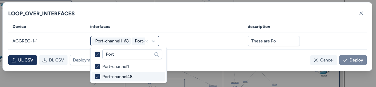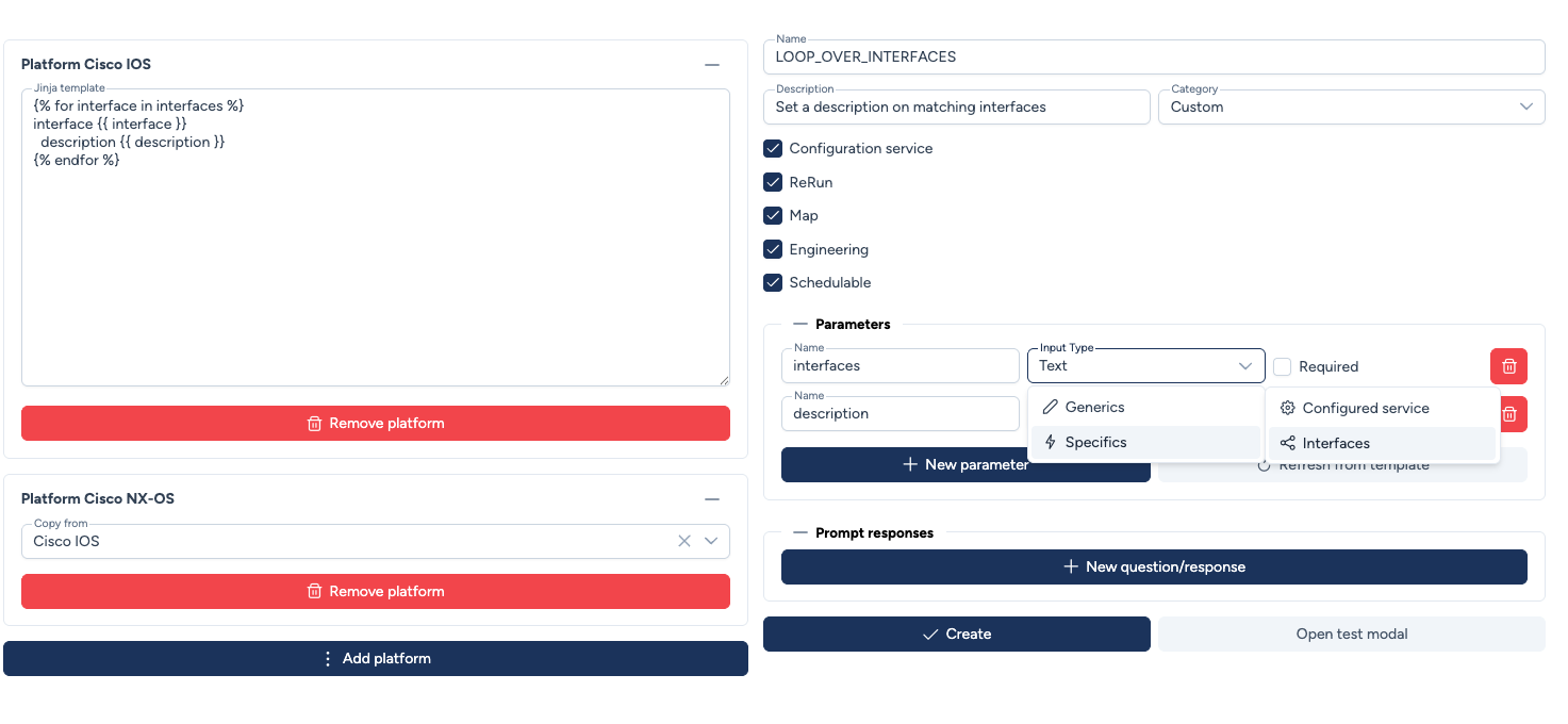 Le template utilisé pour Cisco IOS est le suivant pour boucler sur une liste d'interface et y ajouter une descrption :