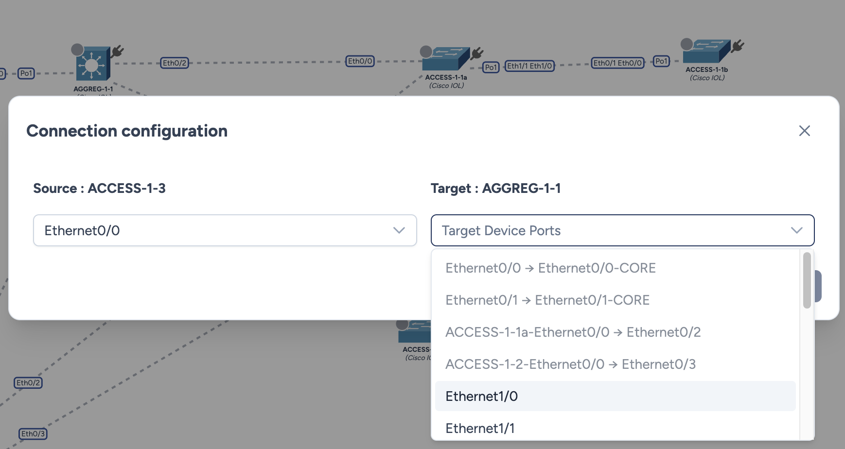 En relâchant le lien, une modale de configuration apparaît pour mapper les interfaces physiques.