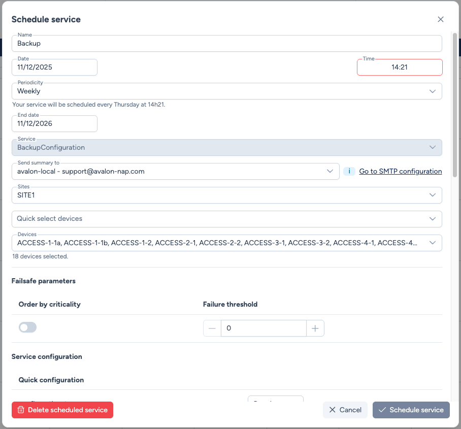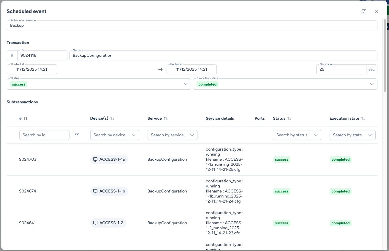Le module Services planifiés permet d'automatiser les opérations réseau en les planifiant à l'avance. Que ce soit pour une intervention ponctuelle ou une tâche récurrente (ex : sauvegardes hebdomadaires), le planificateur orchestre ces opérations.