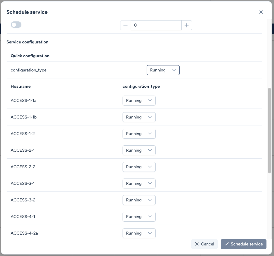 - Select Devices : Utilisez le menu déroulant Quick Select pour filtrer par Type, Building ou Redundancy Group, ou sélectionnez les équipements individuellement.