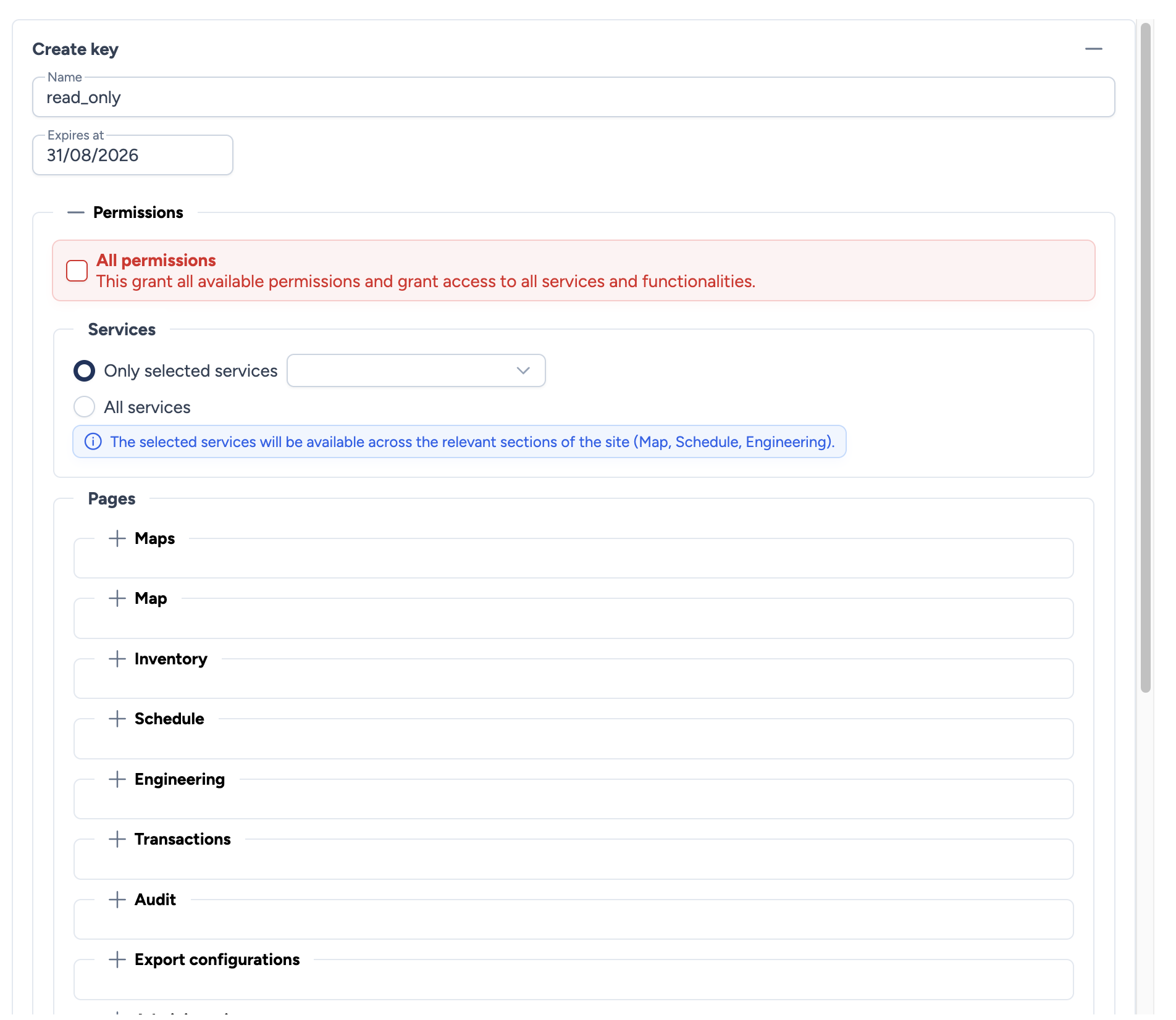 monitoring_readonly,ci_deploy). - Expires at: Optional expiration date. At this date, the key will be automatically rejected. Leave empty for a key without expiration.