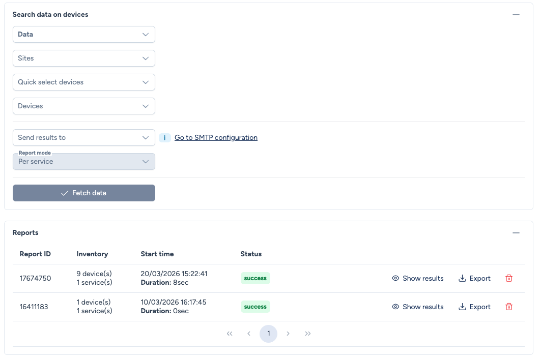 Per serviceorPer device). - Fetch data: Launches the collection on the selected devices.