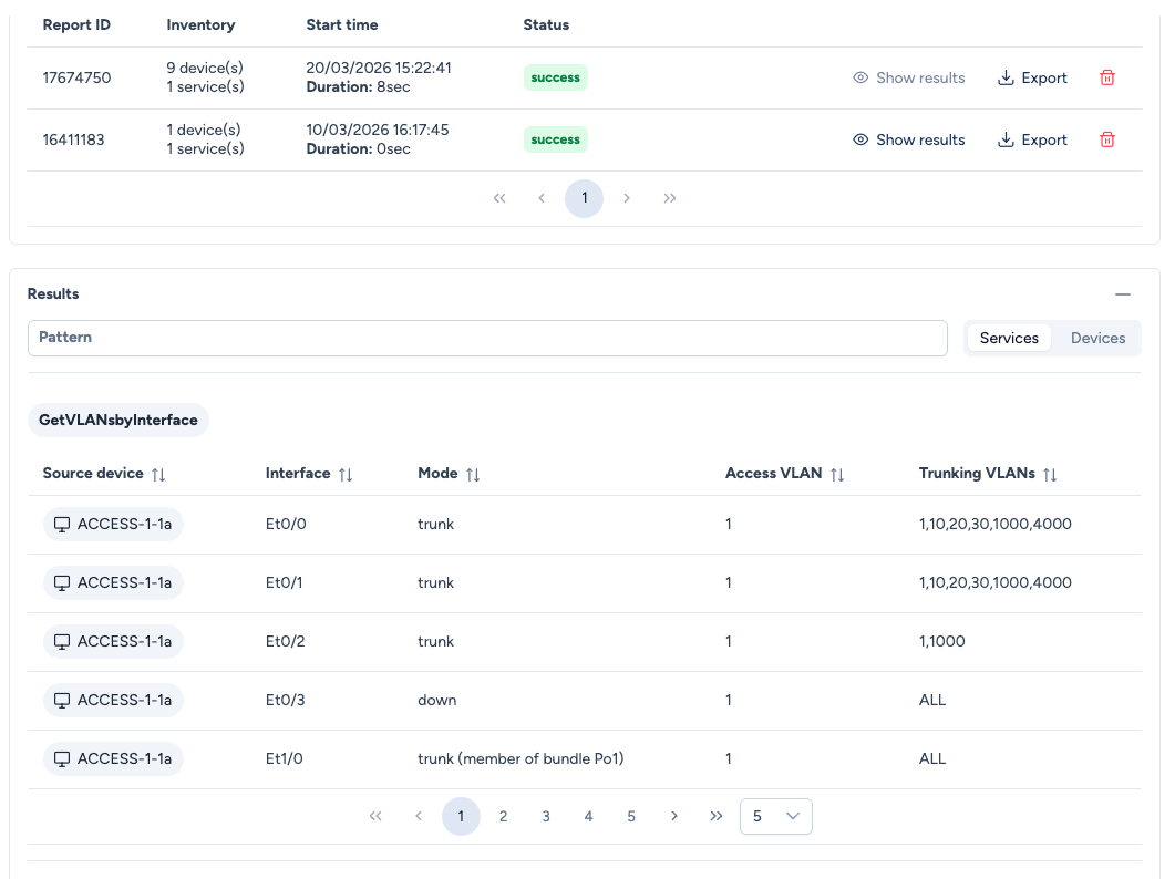 - Services: Groups data by collection type. Ideal for global audits (e.g., "all VLAN interfaces across the entire site").
