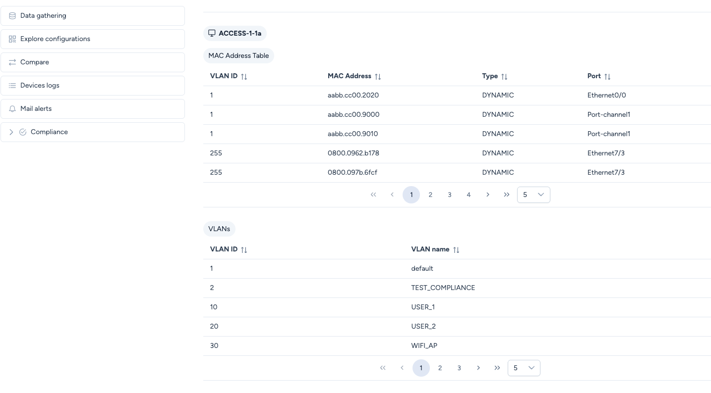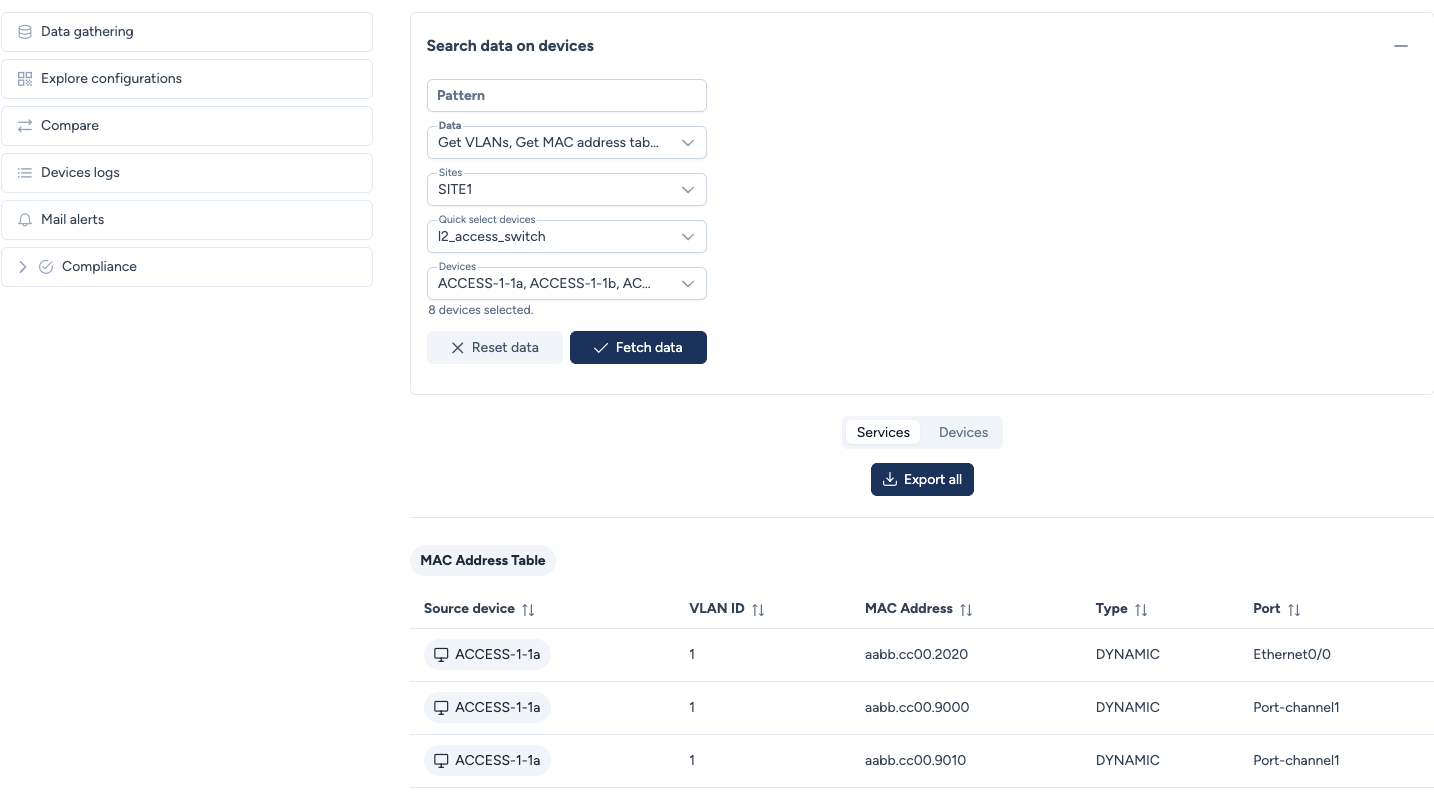 - You see one consolidated table per requested service (e.g., one table for all MACs, one table for all VLANs).