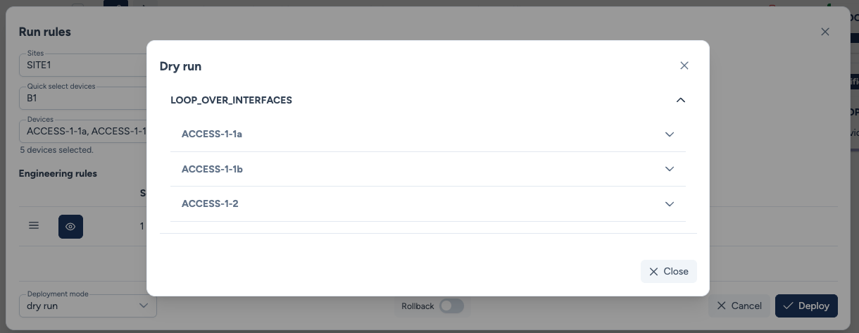 While triggering a dry run, Avalon identifies that only ACCESS-1-1a, ACCESS-1-1b, and ACCESS-1-2 contain ports matching these criteria.