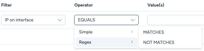 - MATCHES: Allows the use of Regular Expressions. E.g., to target a source interface with an IP starting with