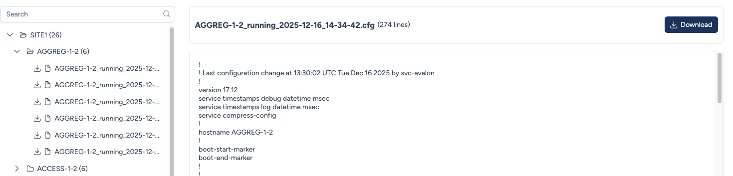 Hostname_Type_Timestamp.cfg(e.g.,AGGREG-1-2_running_2025-12-16...). - Search: You can use the search bar at the top to quickly find a specific device or file within the tree.