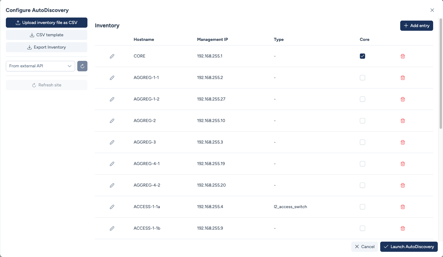 As you can see the Launch AutoDiscovery button is not yet enabled because no device has been defined as the core of the site.