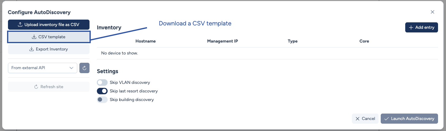 The CSV will still be imported into the AutoDiscovery modal and you will be able to modify device properties directly in the Datatable.
