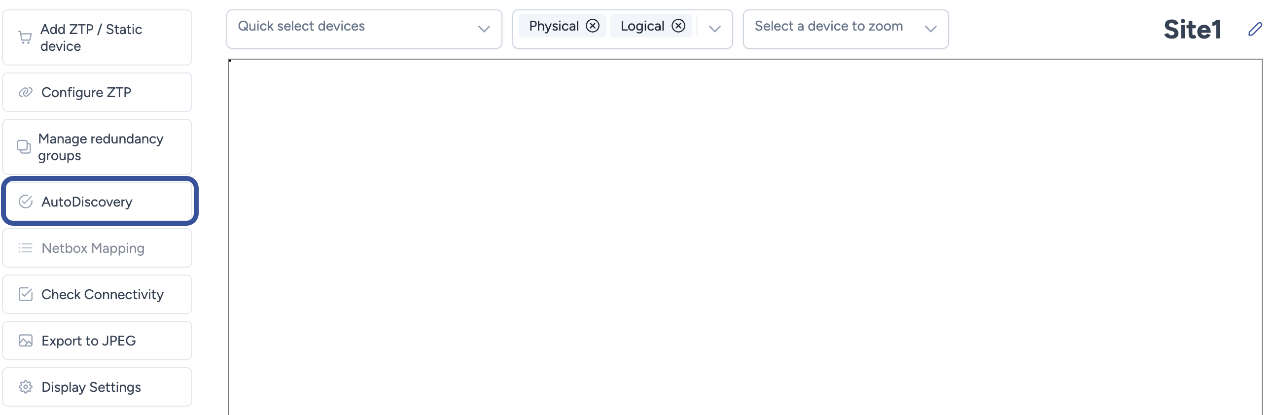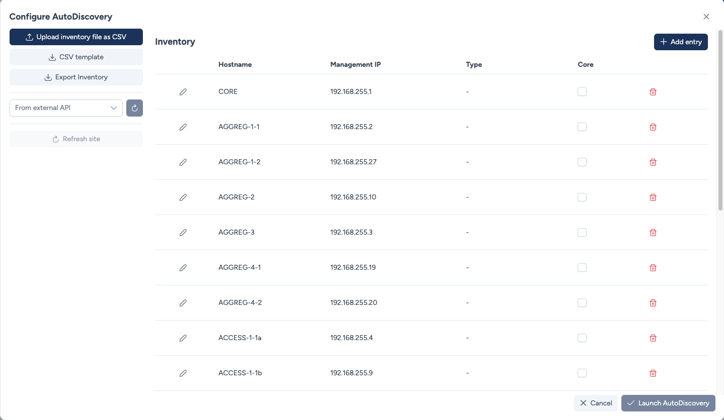 Comme vous pouvez le voir, le bouton Launch AutoDiscovery n'est pas encore activé car aucun équipement n'a été défini comme le core du site.